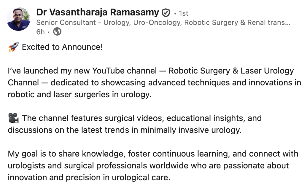While we are pleased to have an extensive listing of robotic surgery videos on our website, we are happy to share the news that Vattikuti Fellowship Alumni Dr. Vasantharaja Ramasamy has built his own YouTube video channel, the "Robotic Surgery & Laser Urology Channel."